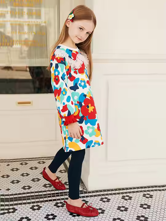 /OEM Floral Print Girl Long t Shirt Dress With Leggings Spring Kids Children Clothing Set Boutique