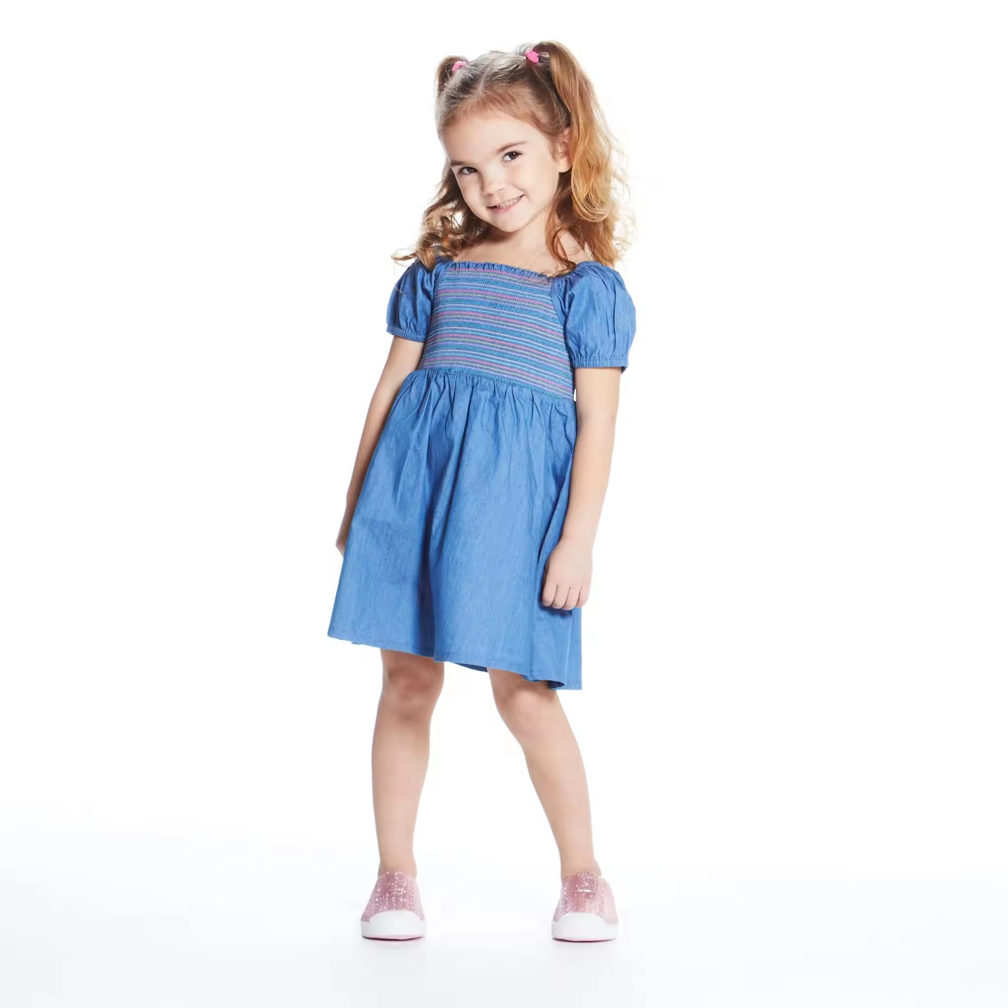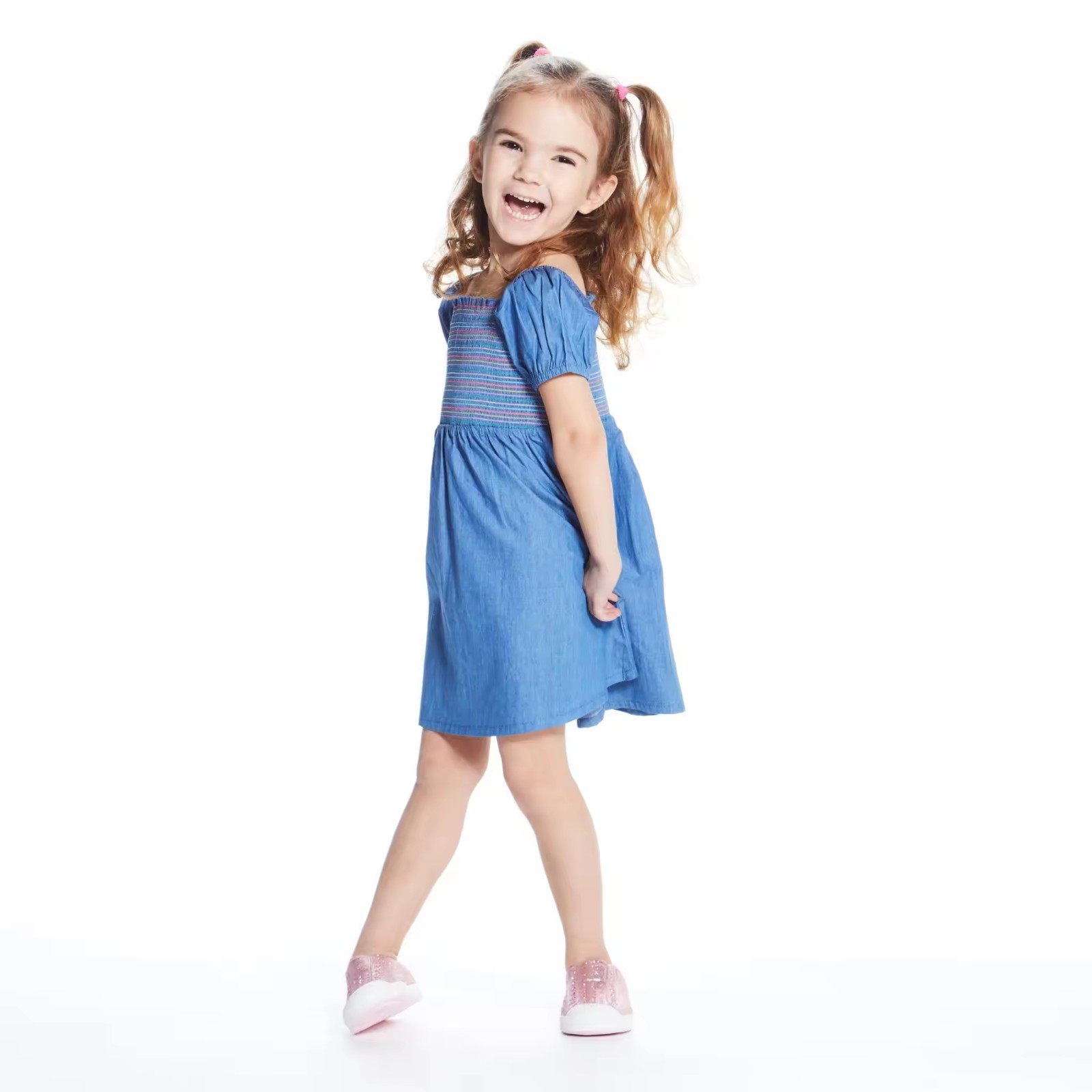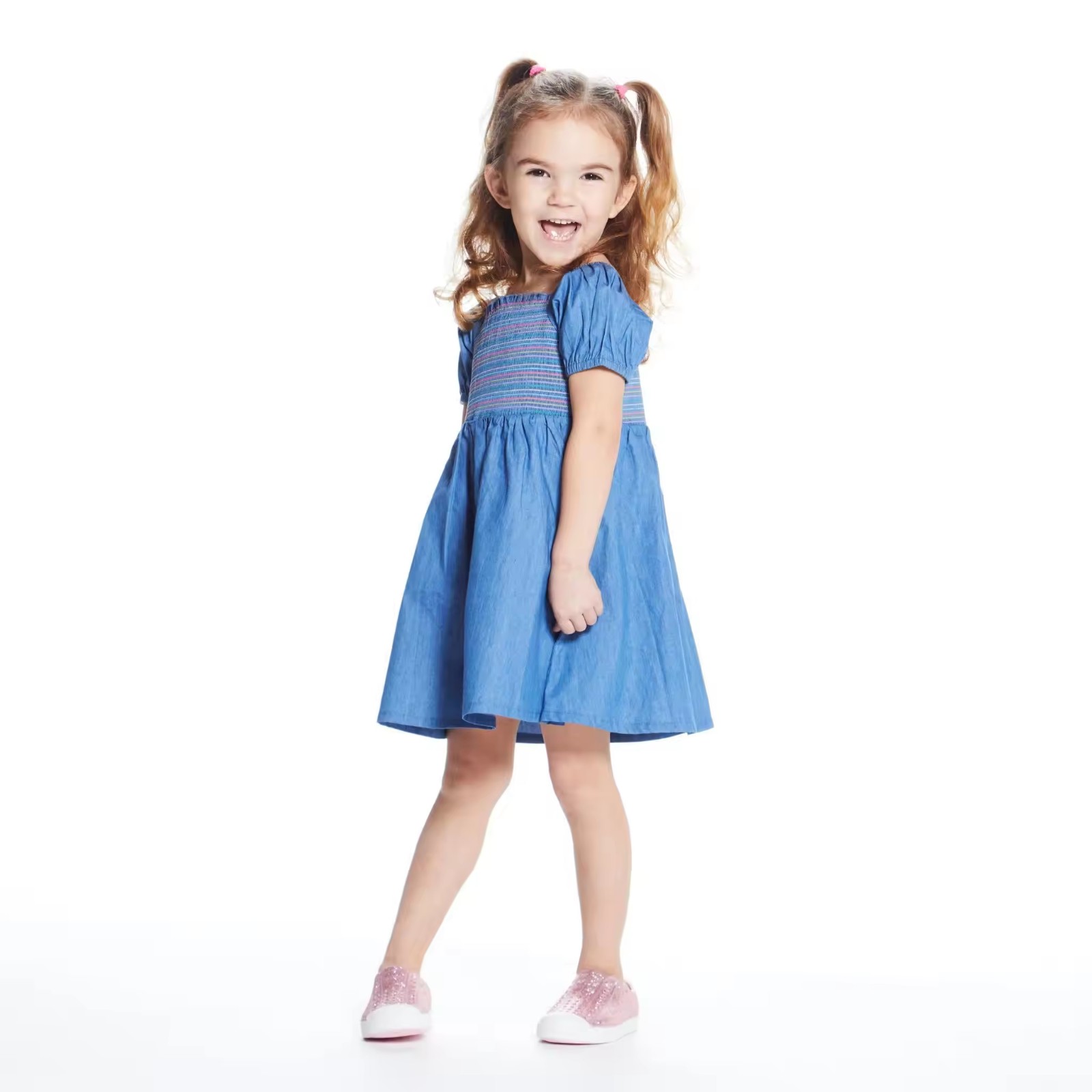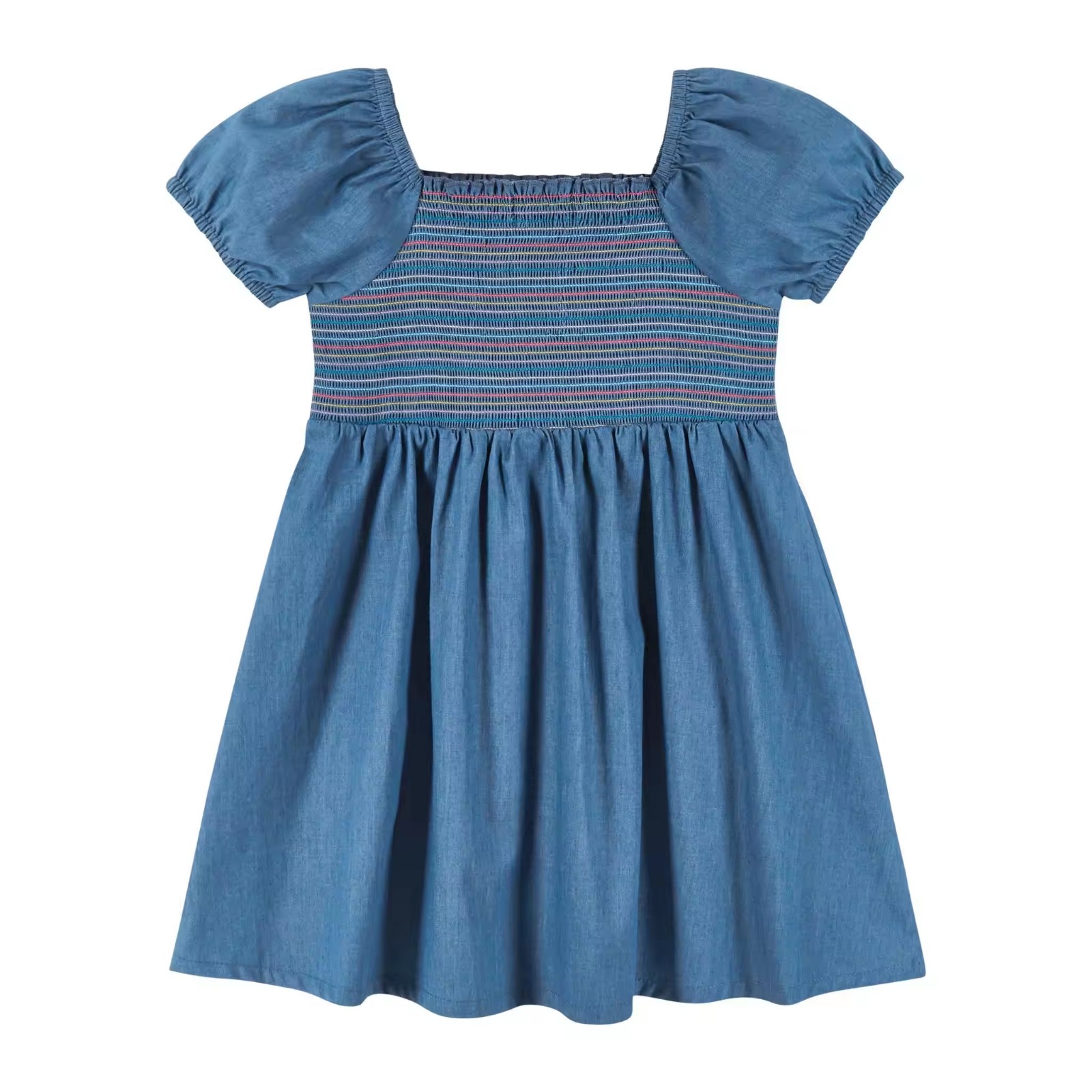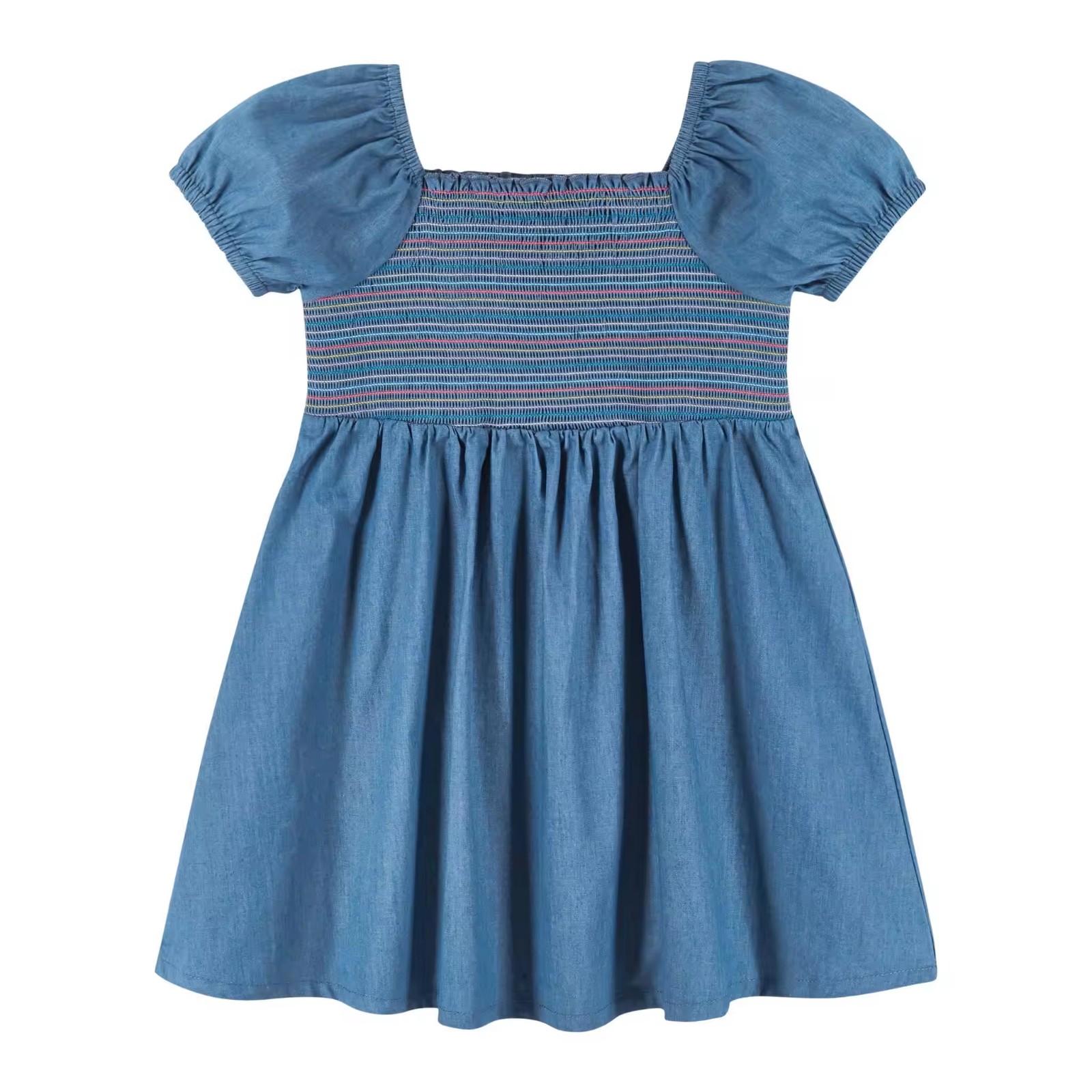 /Custom Soft Denim Dress for Toddler Baby Girls Dress Summer Puffy Sleeve Girls Smocked Dresses With Colorful Threads