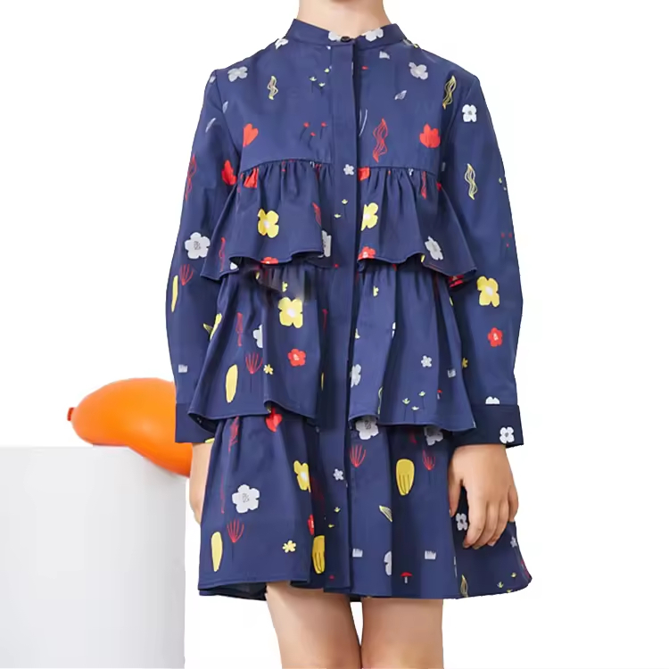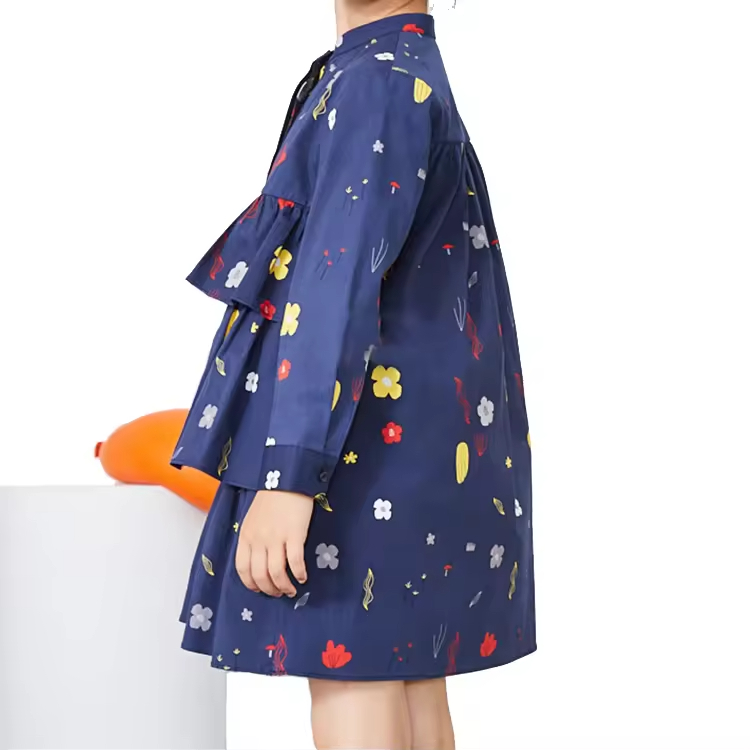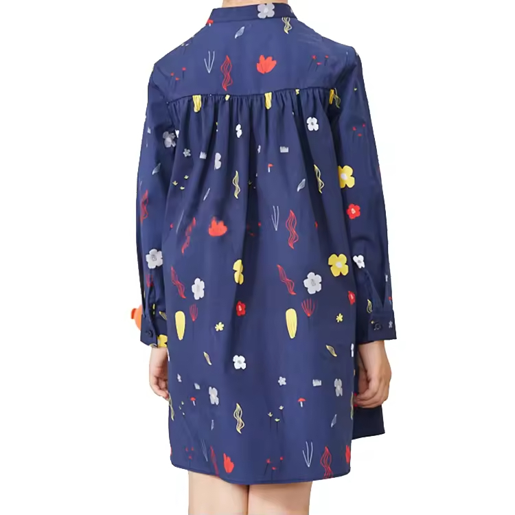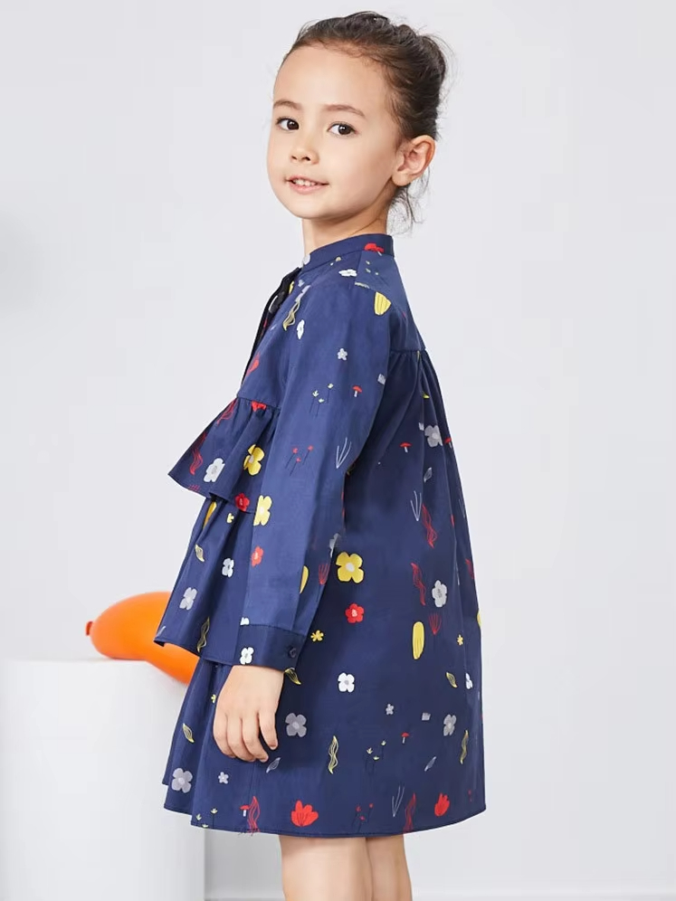 Long Sleeve Cotton Printed Girls Dresses Elegant Casual Knee-Length Woven Fabric for Teenage Girls in Summer