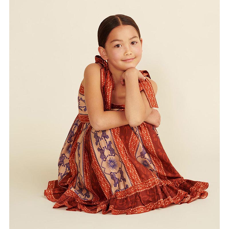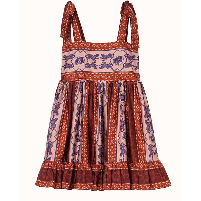 European stylist summer girls dress , rust color with printing A line shape. 100% Cotton with Eco-friendly wash, Acceptable customized logo suitable Summer season in daily life.